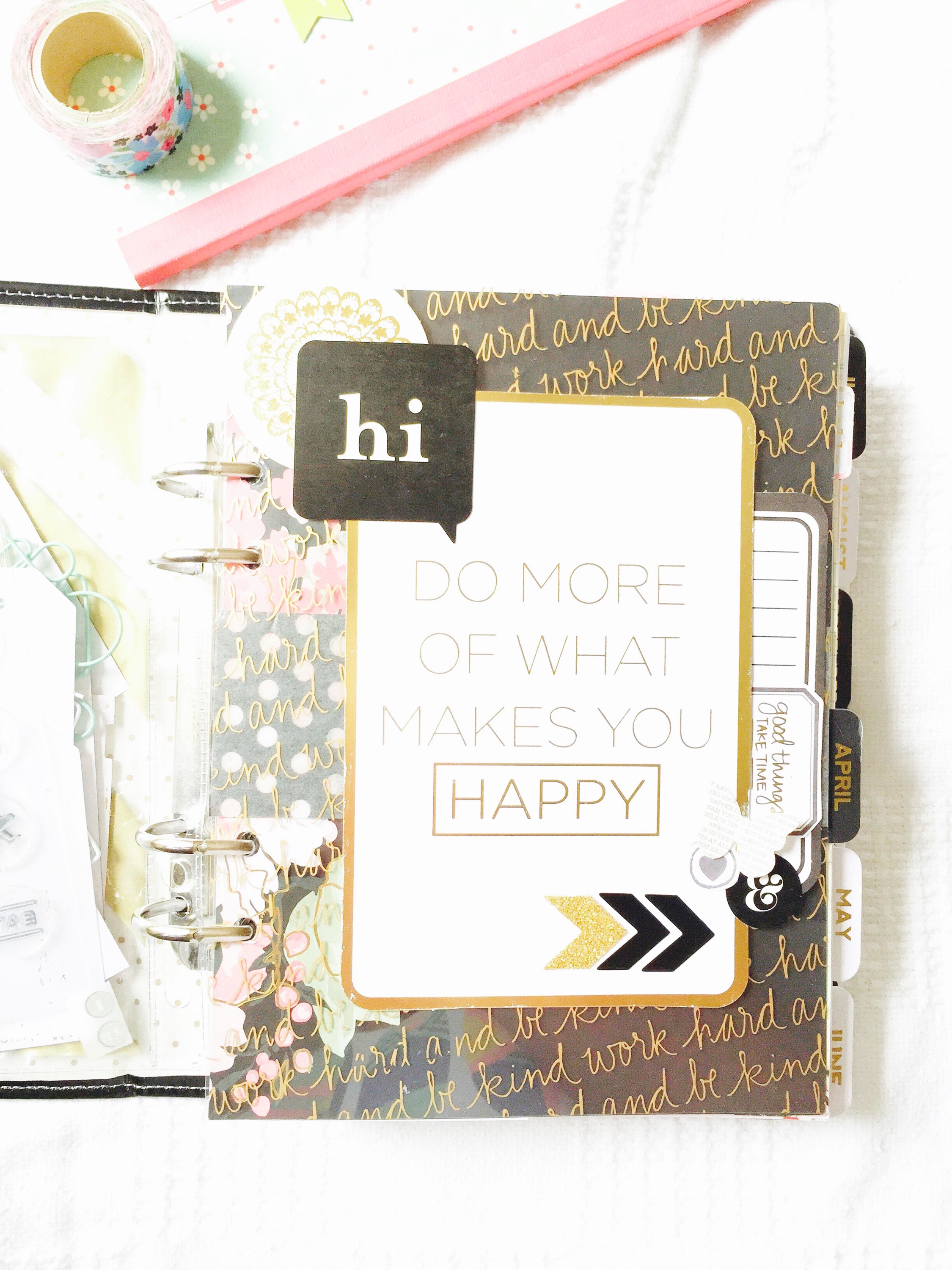 I decided that as my first page I add a quote to inspire me every time I open my planner. I put it atop a Studio Calico transparency paper that says “Work Hard and Be Kind.”