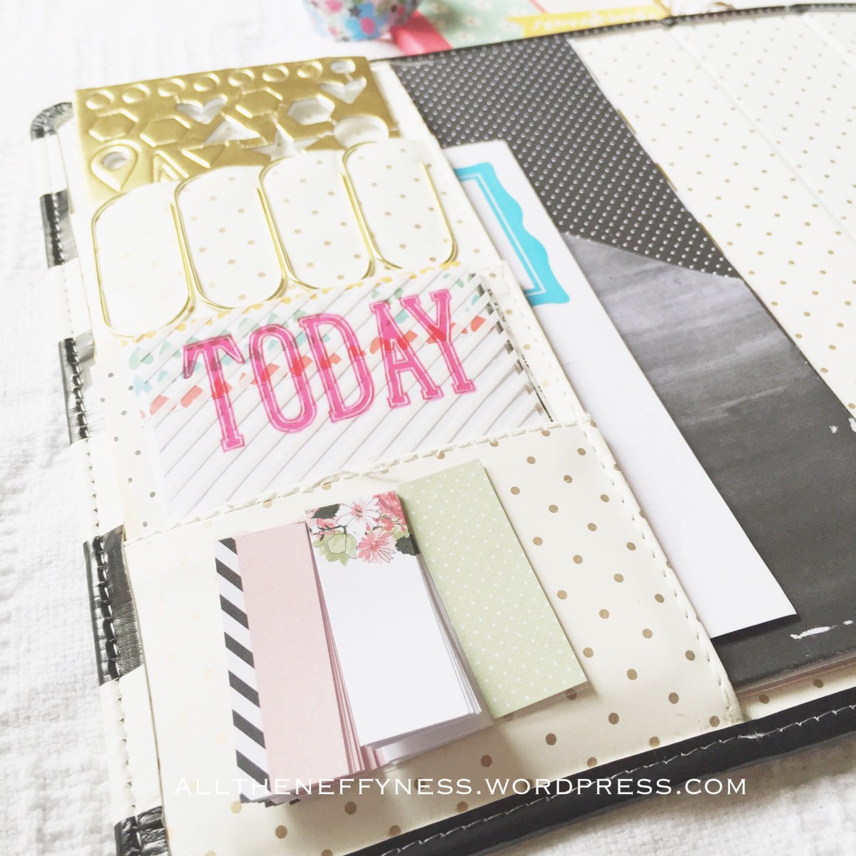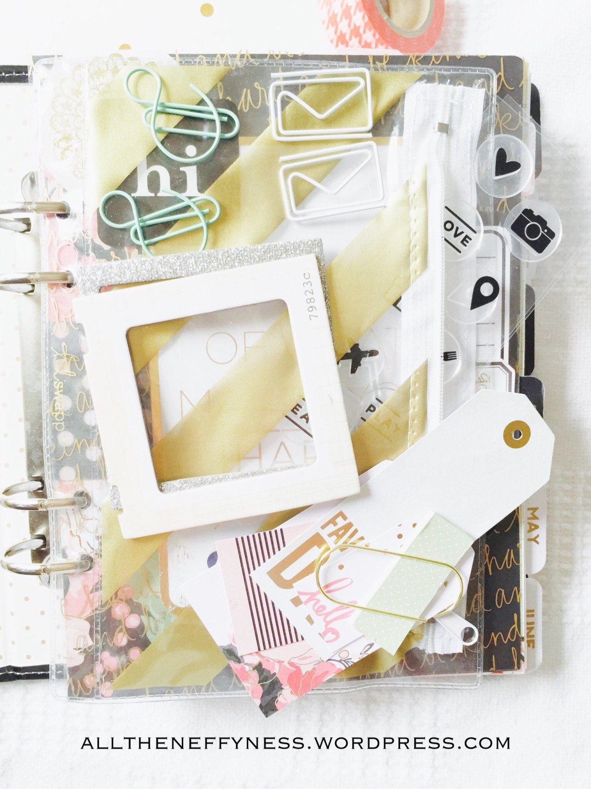 Inside my Memory Planner, as you can see, I have a few items for easy use. I have the Heidi Swapp Gold Striped Pocket where I keep a few bits and pieces including Frames, Tags, Paper Clips, and a Stamp Set. On the other side I’ve added a few more paper clips, some tabs, washi tape stickers, puffy stickers and the pocket pages that are also part of the Heidi Swapp Memory Planner line.