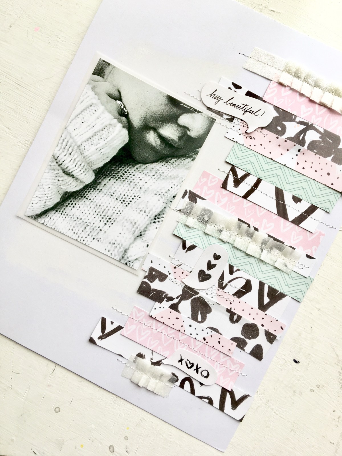 So, I stumbled upon two layouts using strips of paper as the main way to use up the patterned papers. I found inspiration from this one: