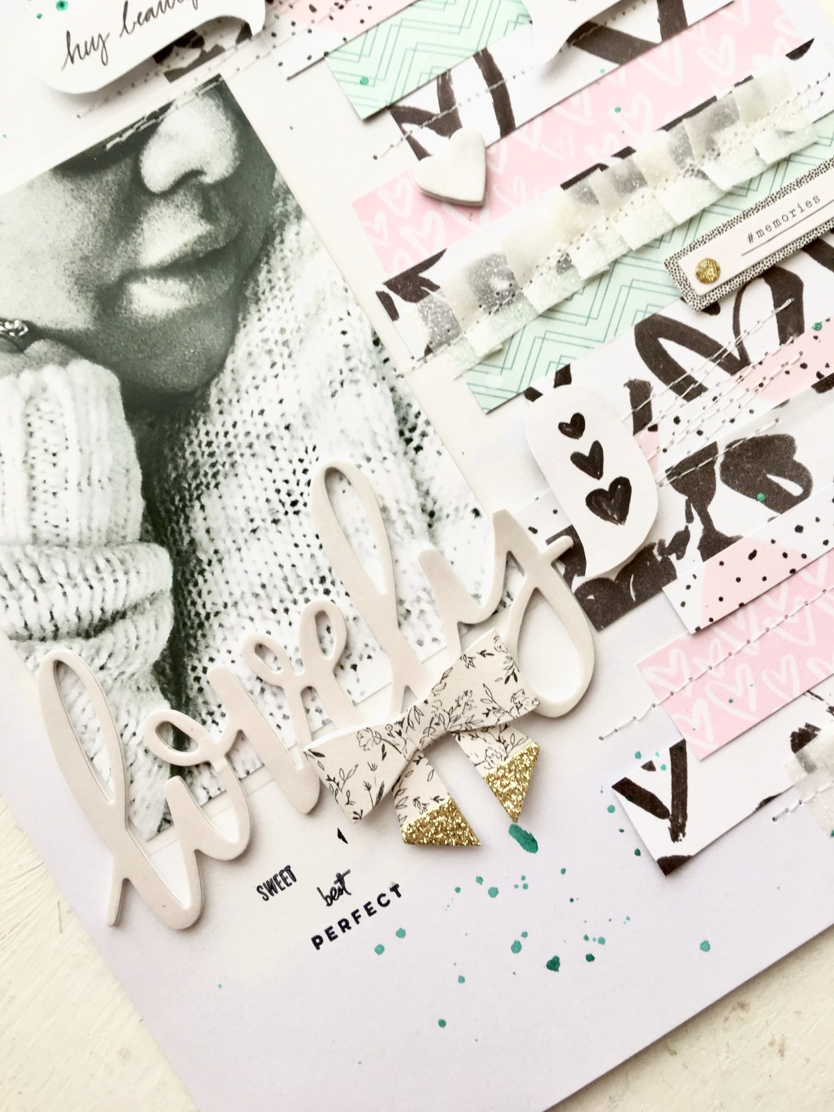 The next step was to add a bit more embellishments. I used some Maggie Holmes embellishment stickers including the two bows.