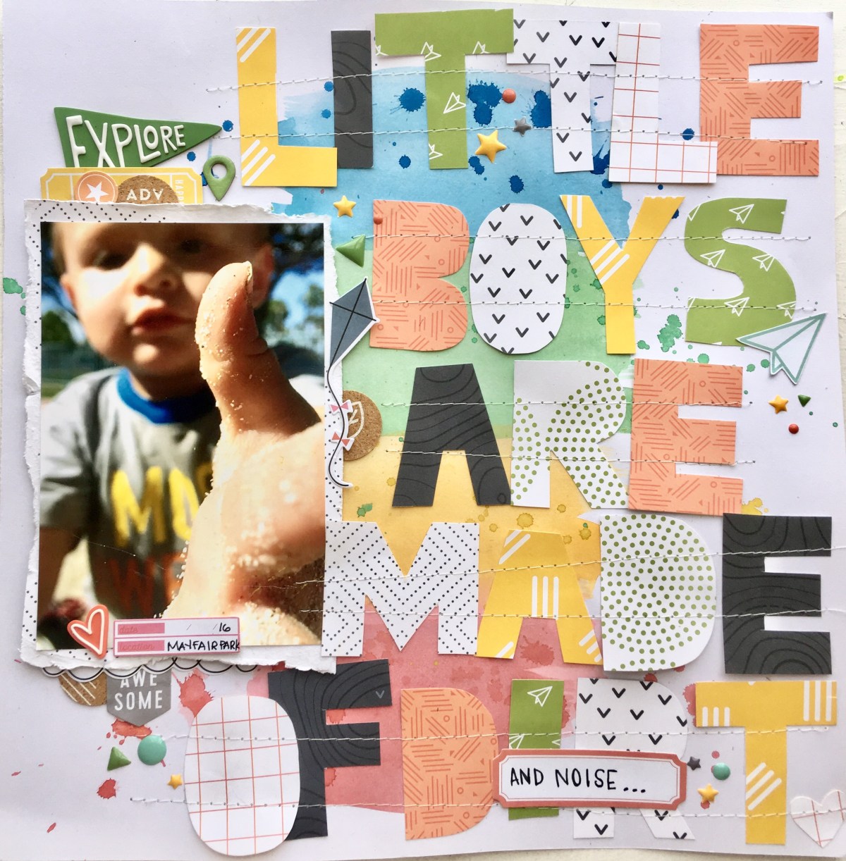 This month’s kit was filled with vibrant greens, oranges, reds, blues and yellows. Perfect for some summery layouts and boy layouts. So I went for the boy layout, of course, and created this: