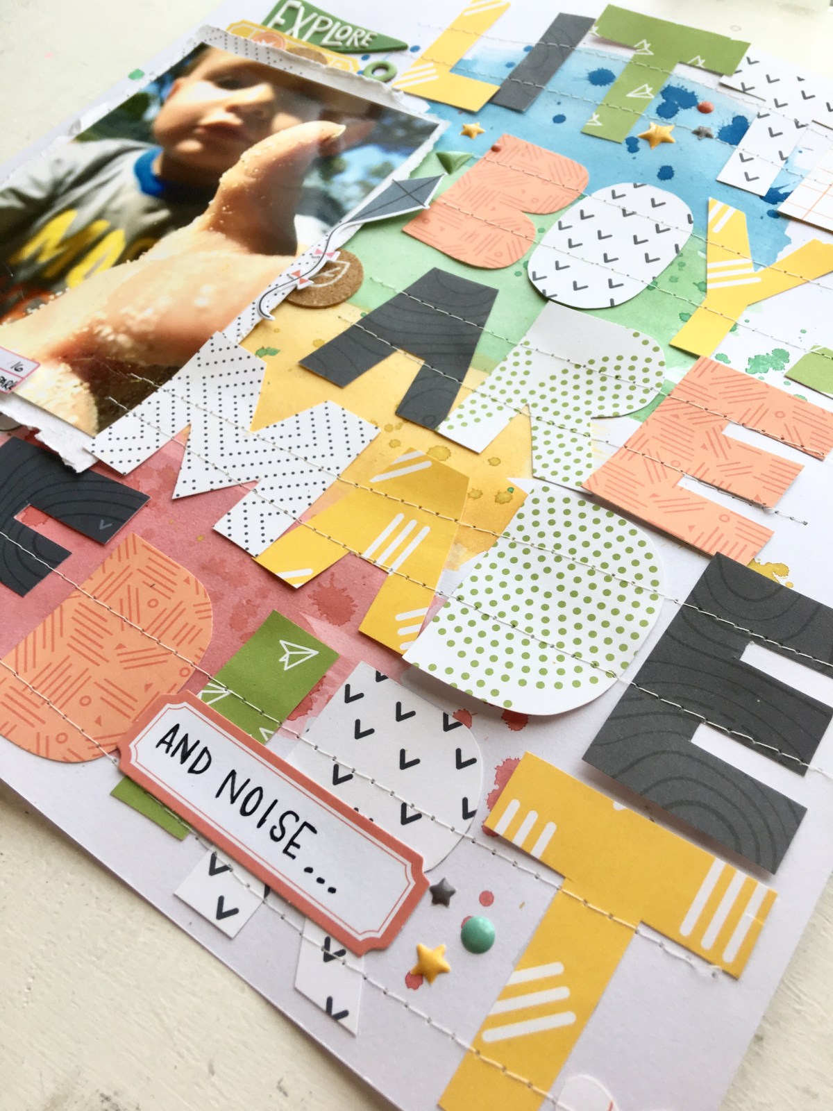 I wanted to really showcase all of the amazing colors and patterns of the exclusive papers we got in the Main Kit. So I decided to create a paper pieced title and use up all of the colorful supplies to create a fun layout of my son’s album.