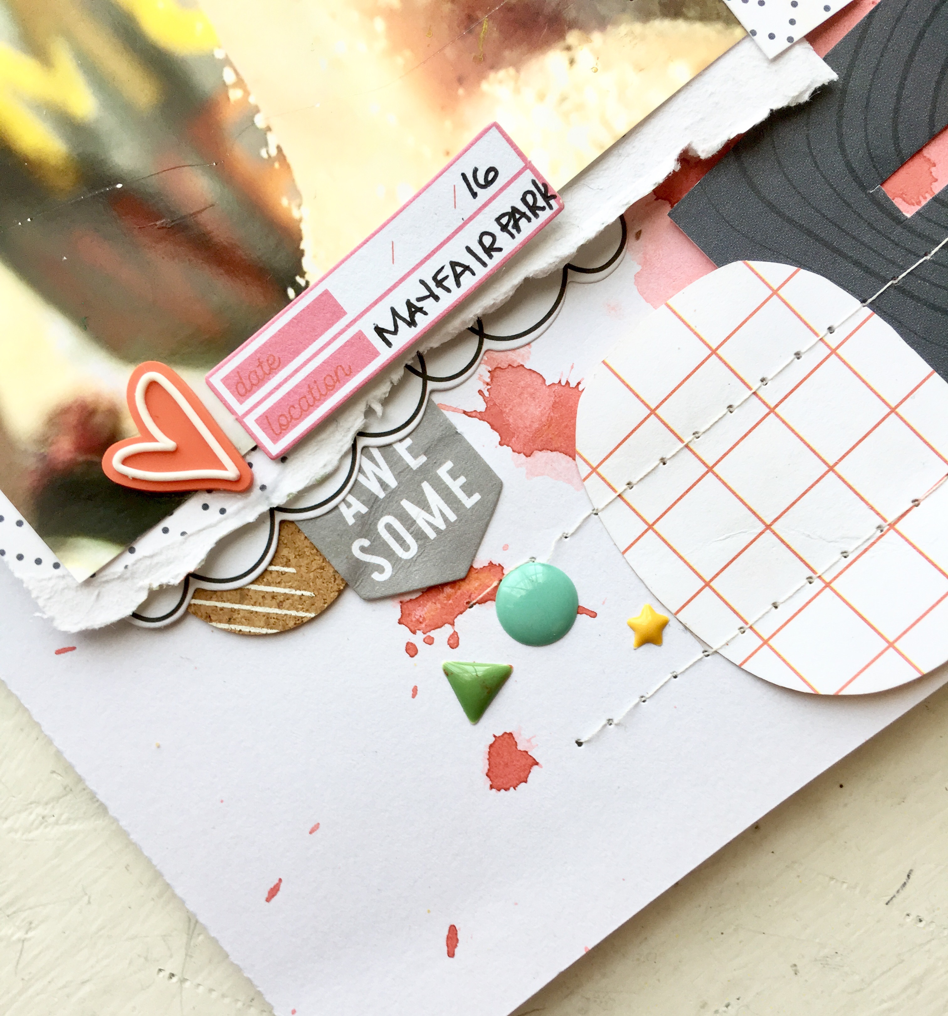 I then came in with a bunch of extra bits and pieces from the kit to add some fun to my photo. I used the enamel shapes, the rubber shapes and the cork stickers!