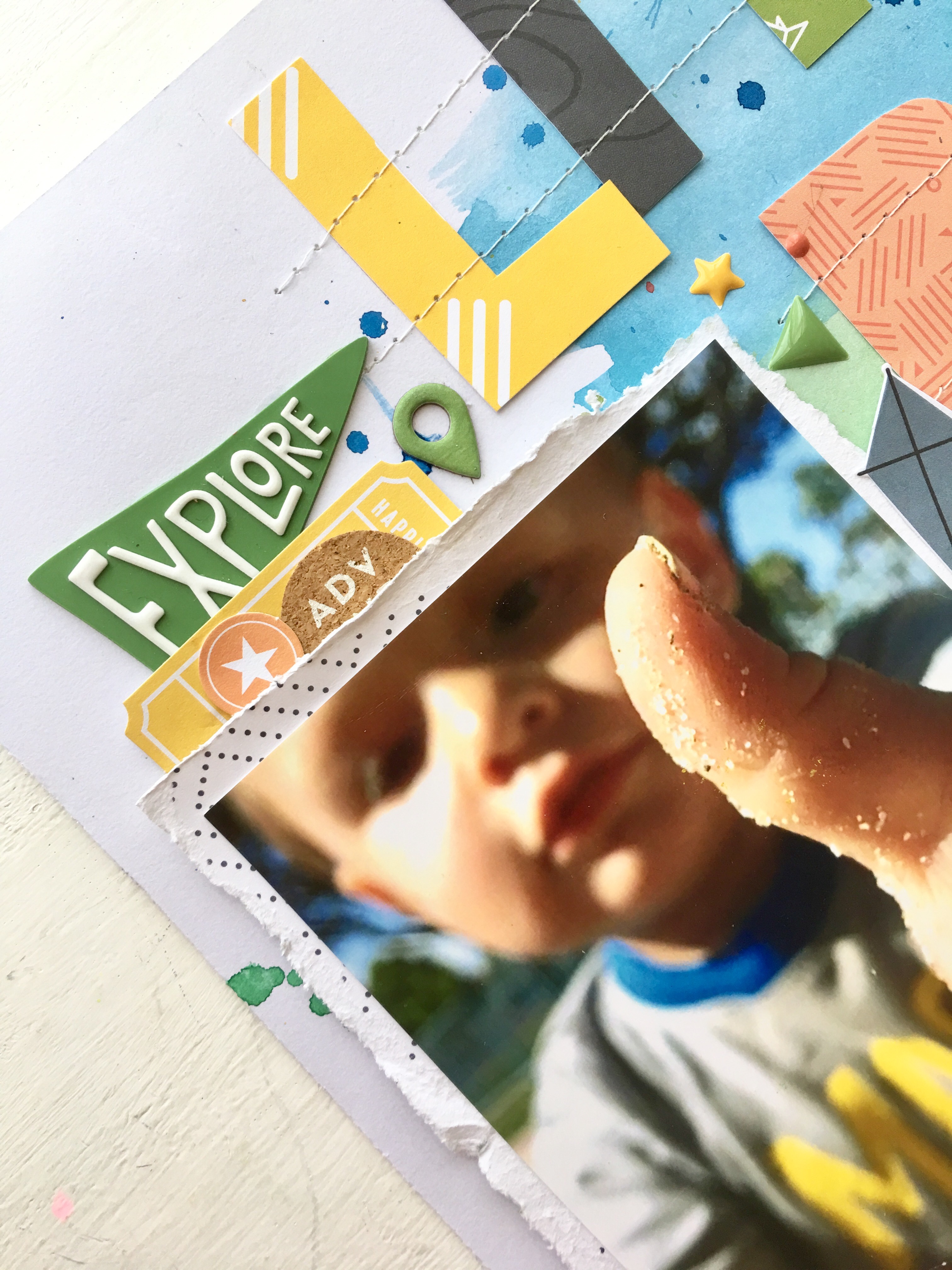 I wanted to really showcase all of the amazing colors and patterns of the exclusive papers we got in the Main Kit. So I decided to create a paper pieced title and use up all of the colorful supplies to create a fun layout of my son’s album.