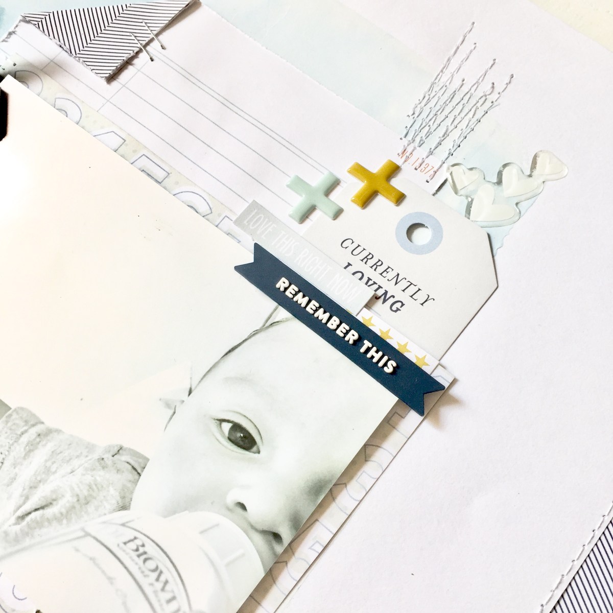 I added a whole lot of everything, but my most favorite part is how this Layout takes your eyes on a little trip. If you start at the top right corner the arrows guide your eyes all the way down in a fun zig-zag way! I love it so much, take a closer look:
