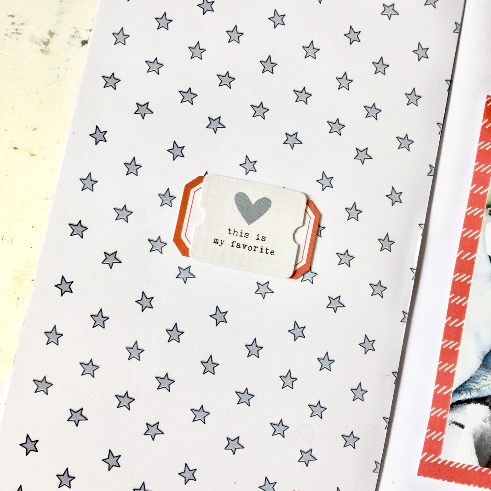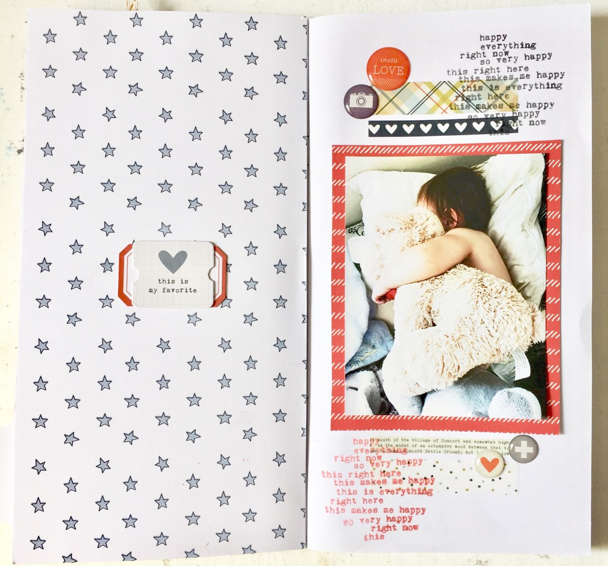 This is one of the Traveler's Notebook spreads I made using only the TN Kit. I have had this adorable photo of my son snuggling his puppy soft animal. I was inspired by the mix of bright reds and soft blues that I thought they went perfect with this photo.