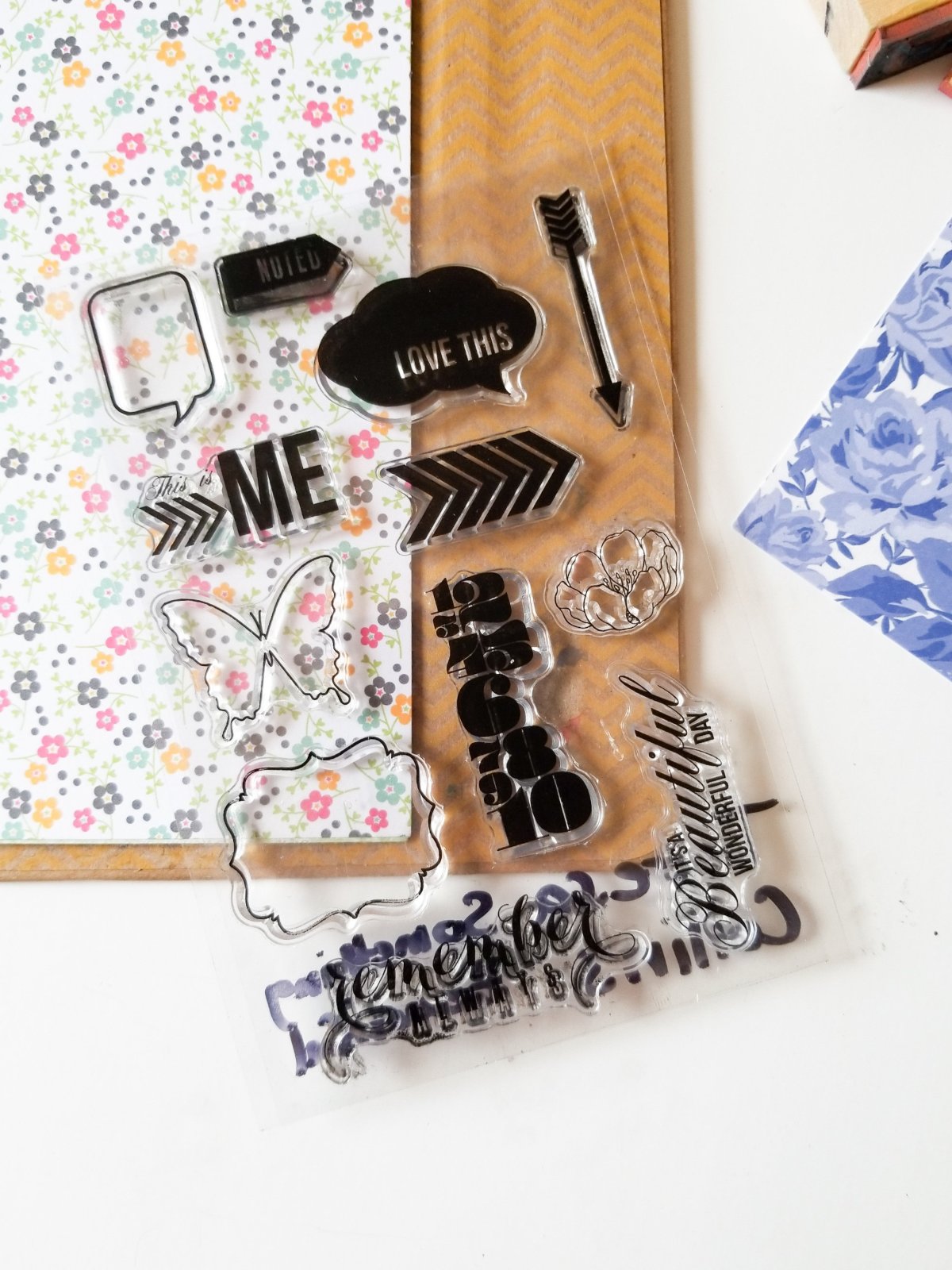 I also found an unused set of acrylic stamps by Theresa Collins in my stash that had cute sentiments like “this is me” and “love this” and of course, florals and butterflies!