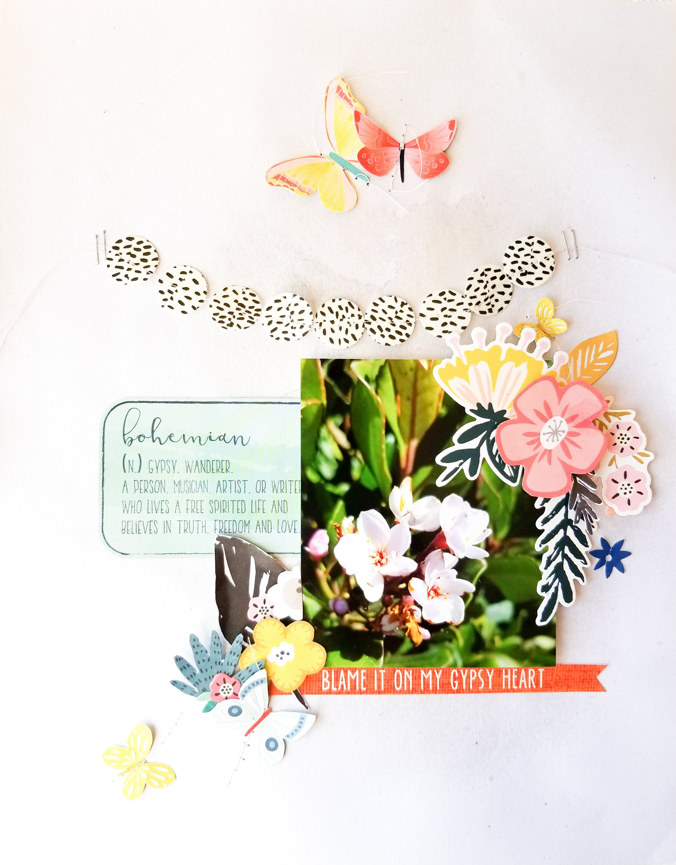 I used some stickers from the Bohemian collection to add a title, Blame It On My Gipsy Heart, and another beside my photo.