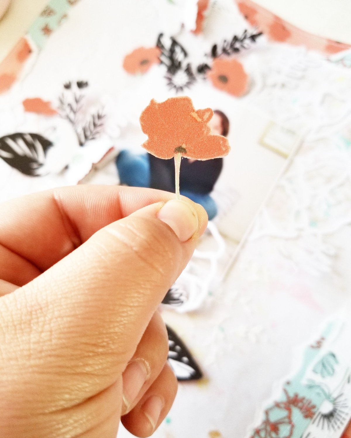 I was trying to figure out how I could add some embellishing without bringing in other products and I decided that I would go my favorite route and fussy cut the floral elements that were in the patterned papers I was using. There were two cute versions of poppy flowers, so I cut the maroon ones and the blue ones. And in order to add some matching contrast, I cut up some vines and leaves off a Crate Paper Good Vibes patterned paper.