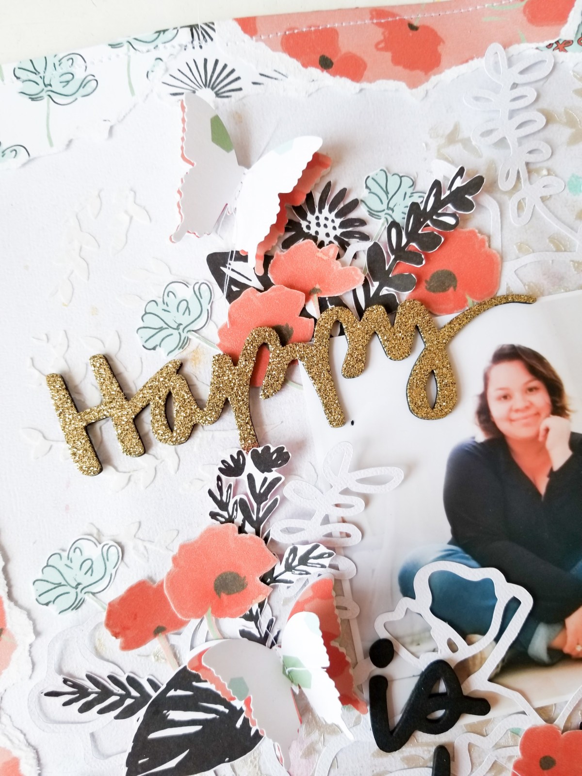 The very final touches were some punched and layered butterflies using the patterned papers. I mean, you can’t have florals without butterflies, riiiight? LOL. And my title was also from Vicki Boutin’s Thickers.