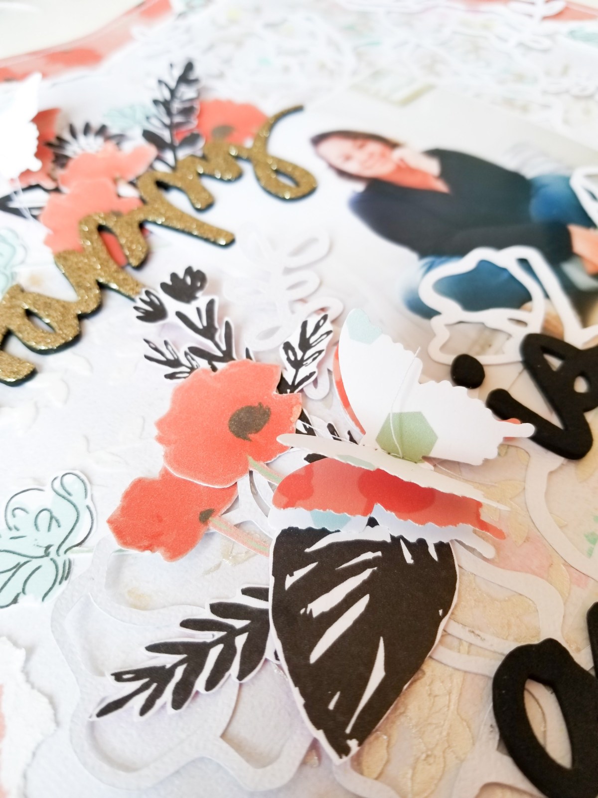 I just created three clusters around my photo with the delicate-looking fussy cut elements. Here are some close ups of those: