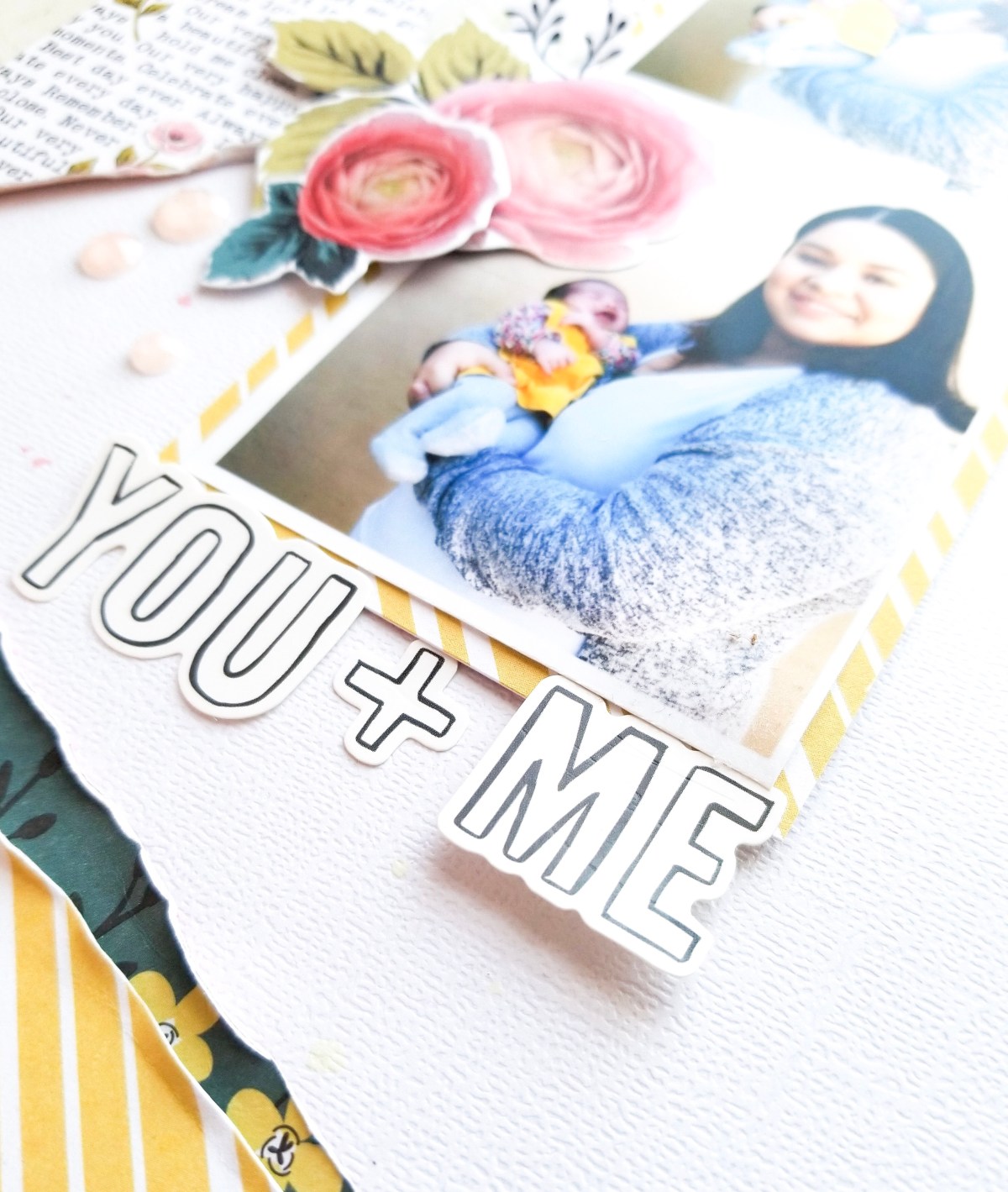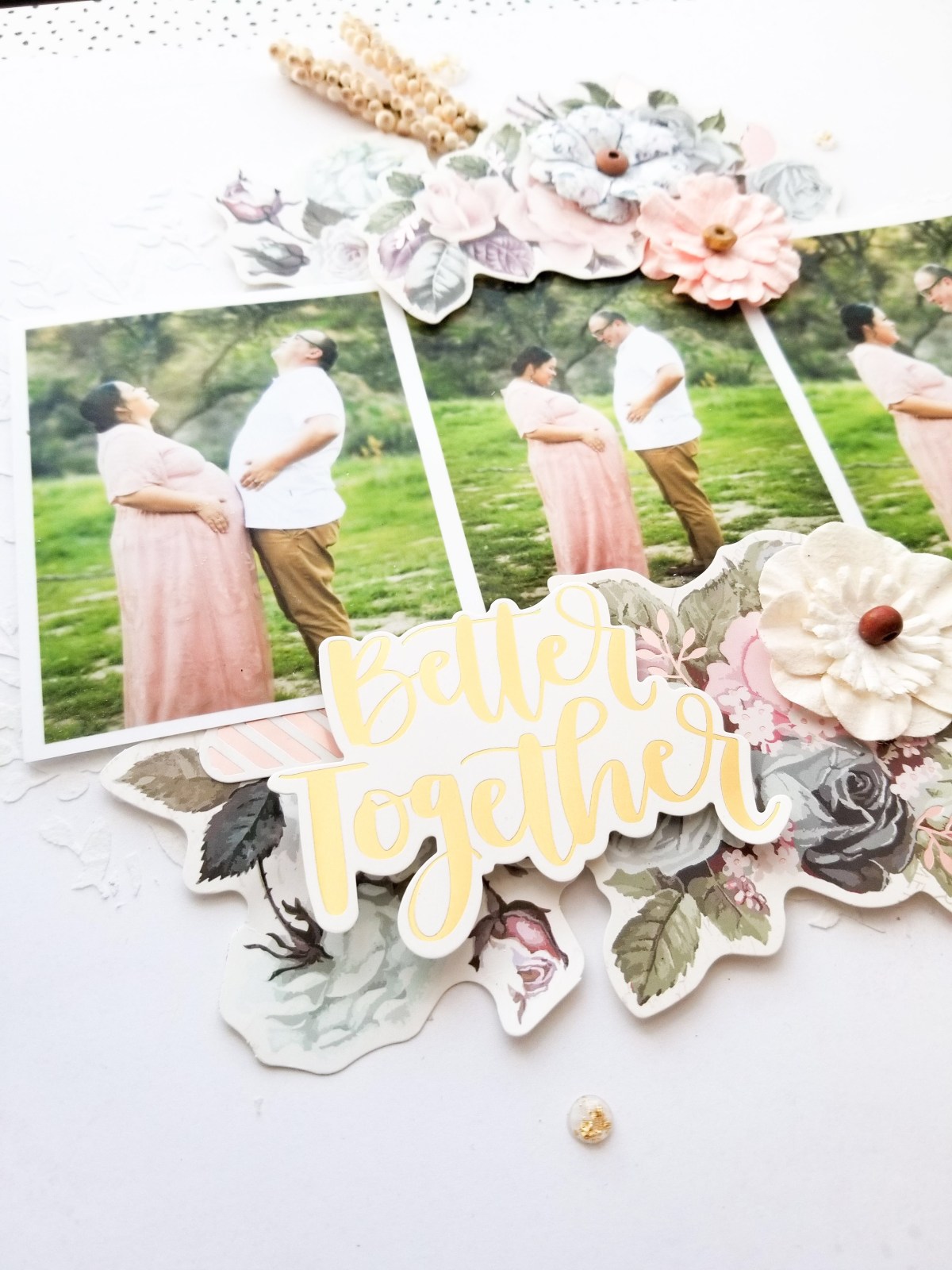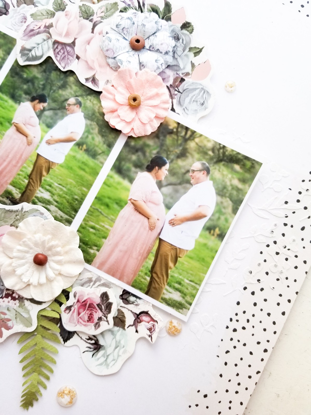 I used Prima, One Canoe Two and a Crate Paper 12×12 card-stock to document a sweet and silly moment with my husband during our maternity photo shoot this past December. I used the Crate Paper dotted paper as my base and added some texture paste above that using a floral stencil. I used so many Prima floral die cuts and finished it of with some paper flowers, and the gold flakes gem stickers. Love this collection by Prima!