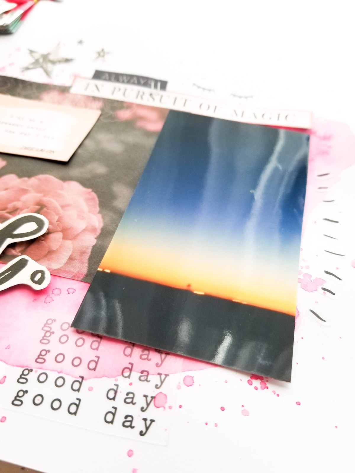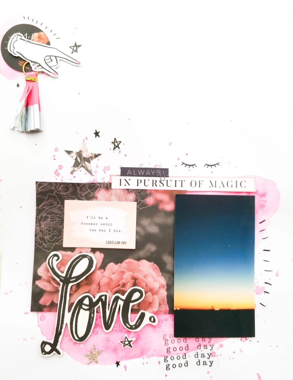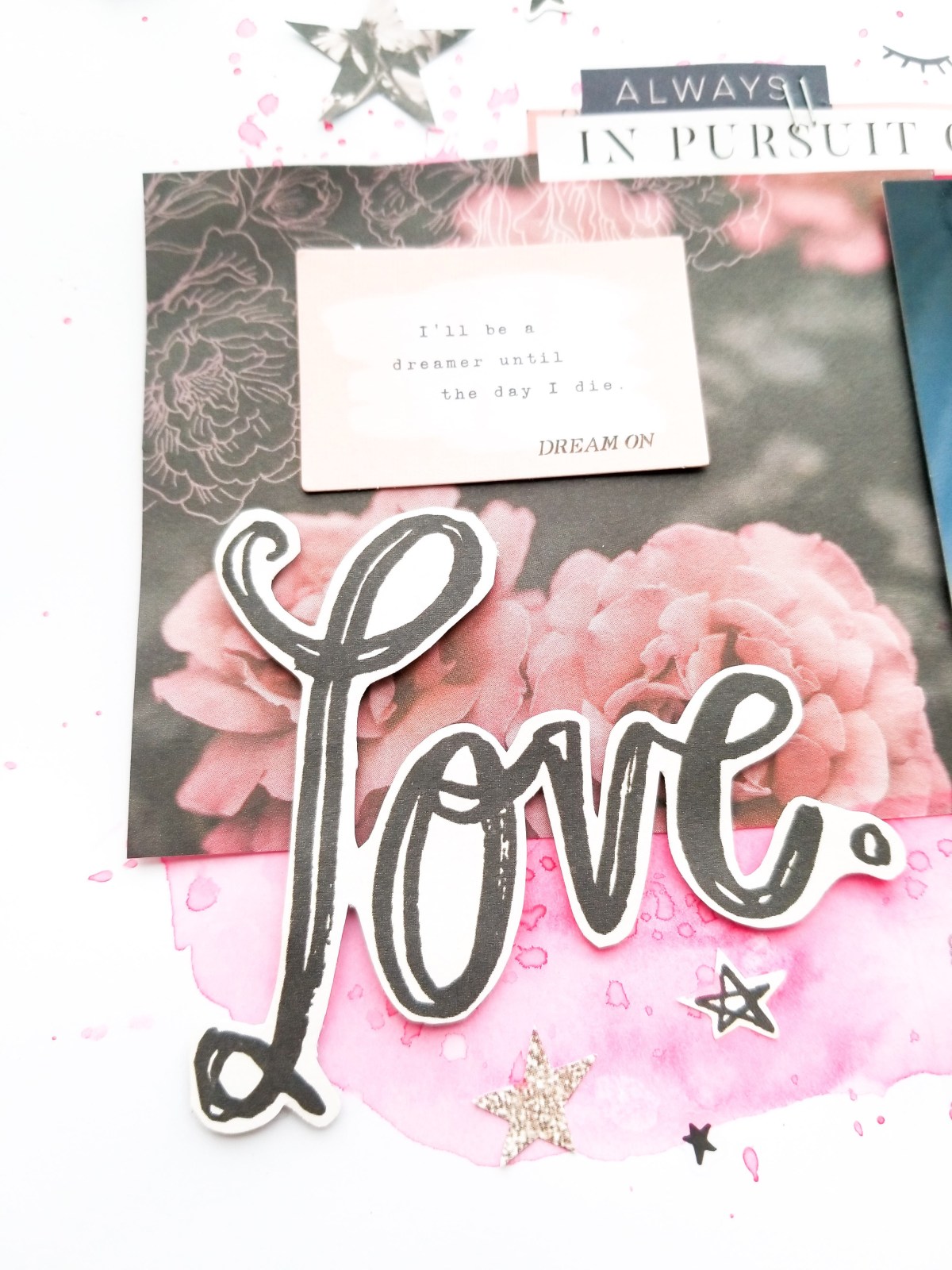 I used some new supplies from the Emma’s Paperie Shop, like the Ken Oliver Watercolor to add an awesome pink base to my page. And I used my new Crate Paper All Heart collection.