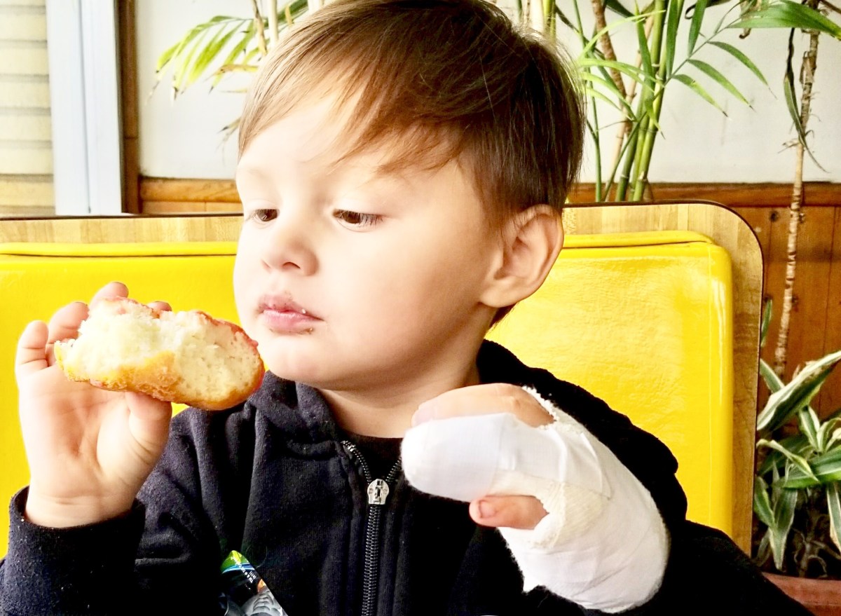 A trip to the ER in an ambulance and 5 stitches later, I finished the project but it was way past Easter at that point to write this post. This was my little champ the day after his accident….