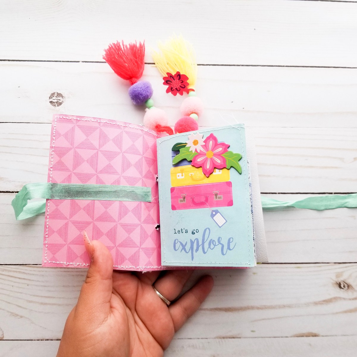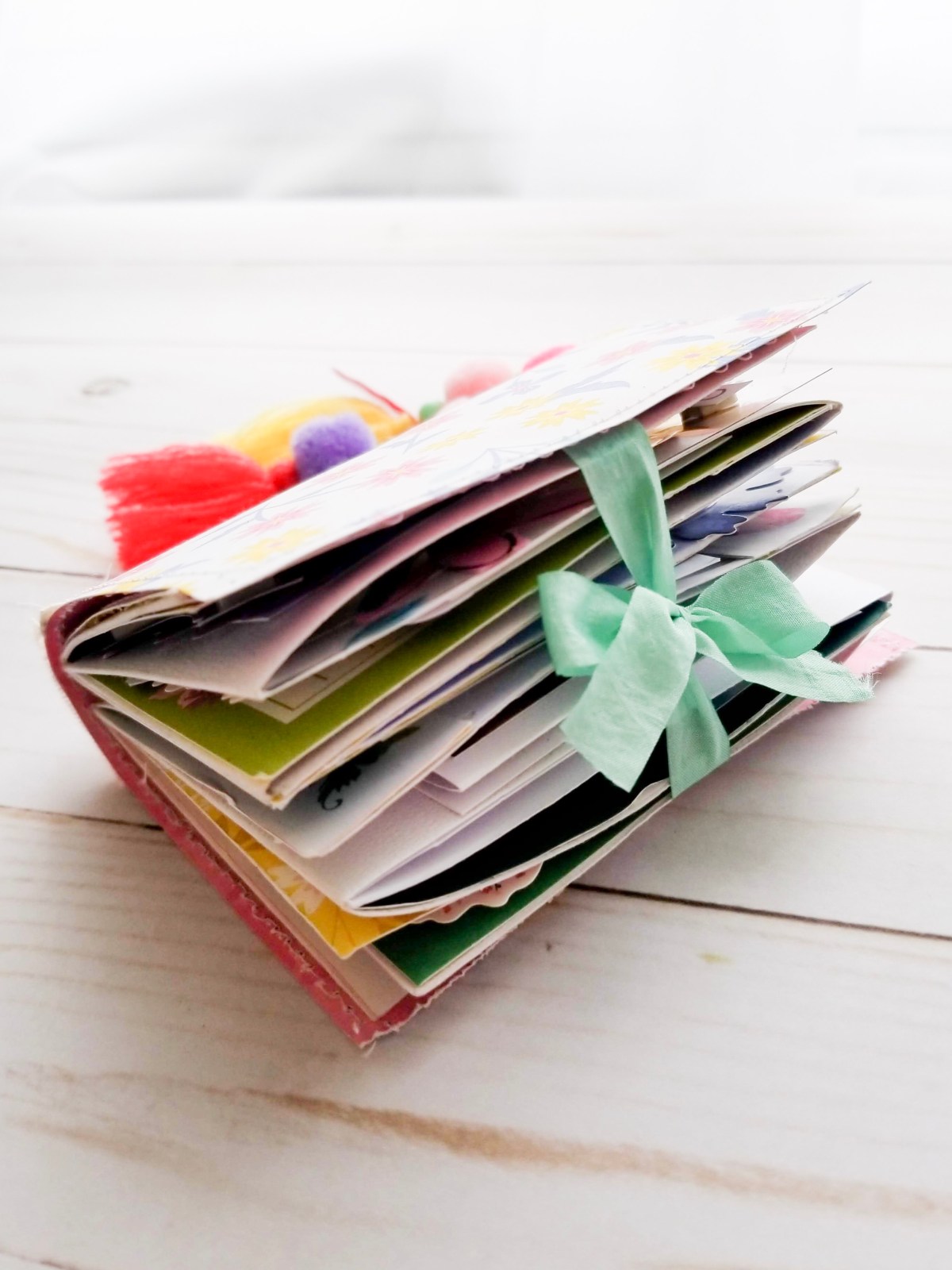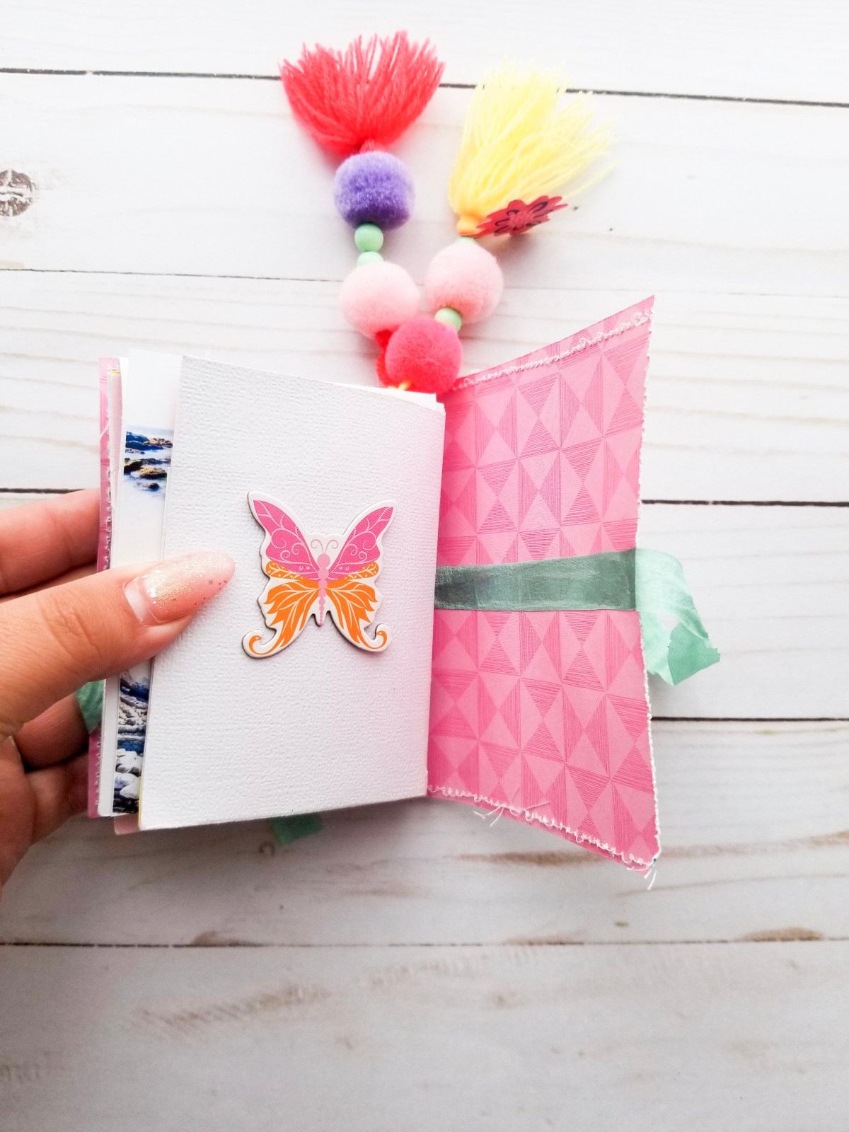 I then added some pretty patterned paper as my cover. The whole book was connected to the cover using some yarn string. Then I added two Amy Tangerine tassel and ribbon to finish it off.