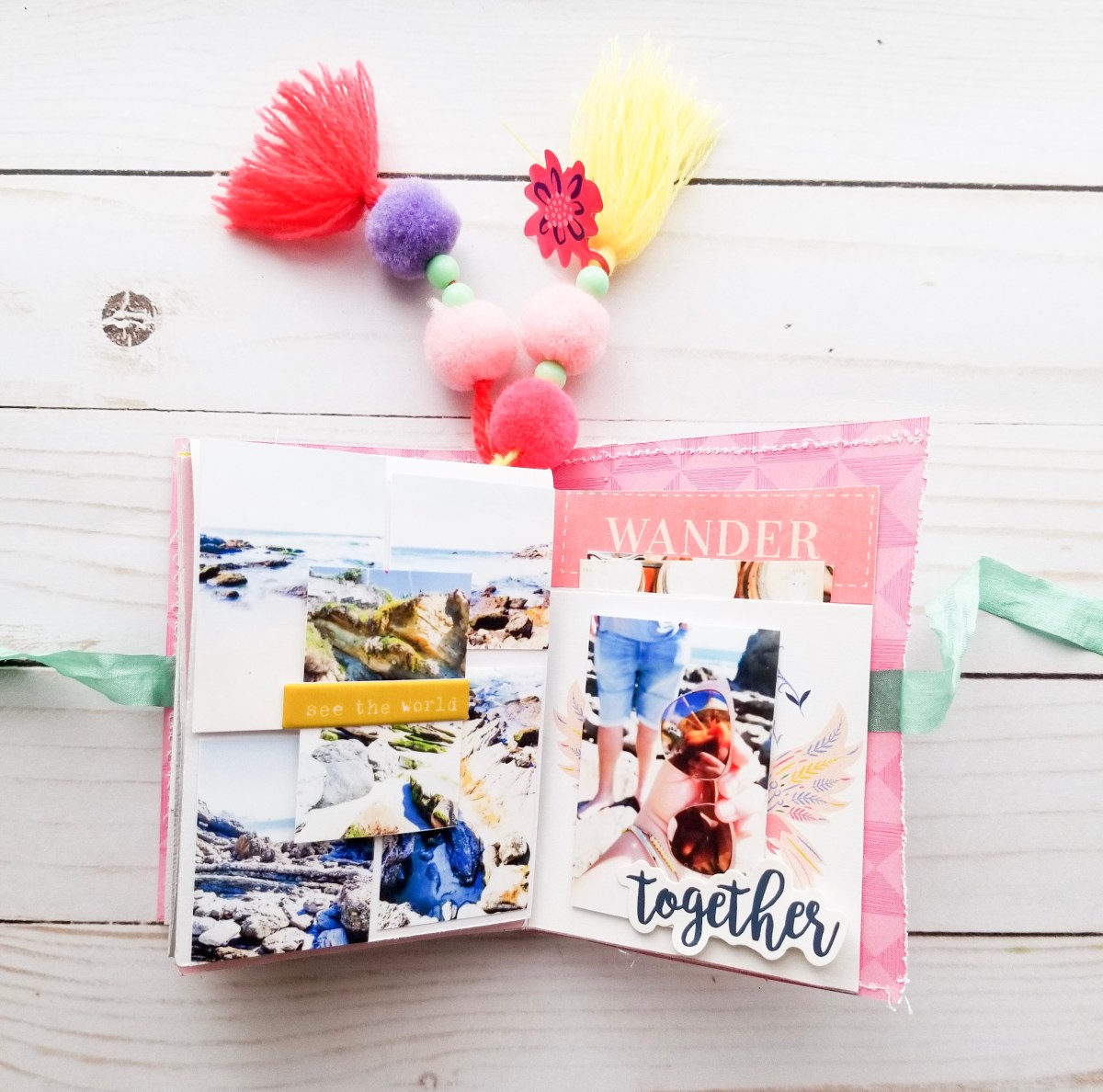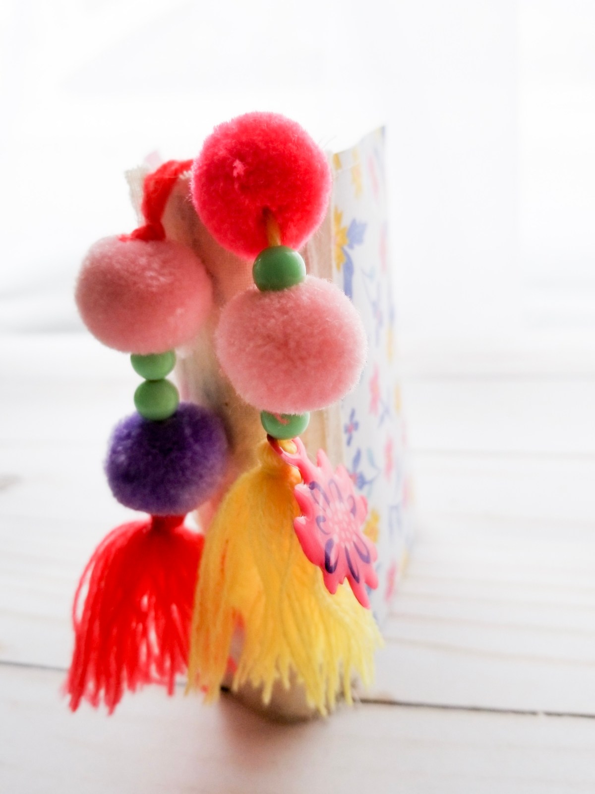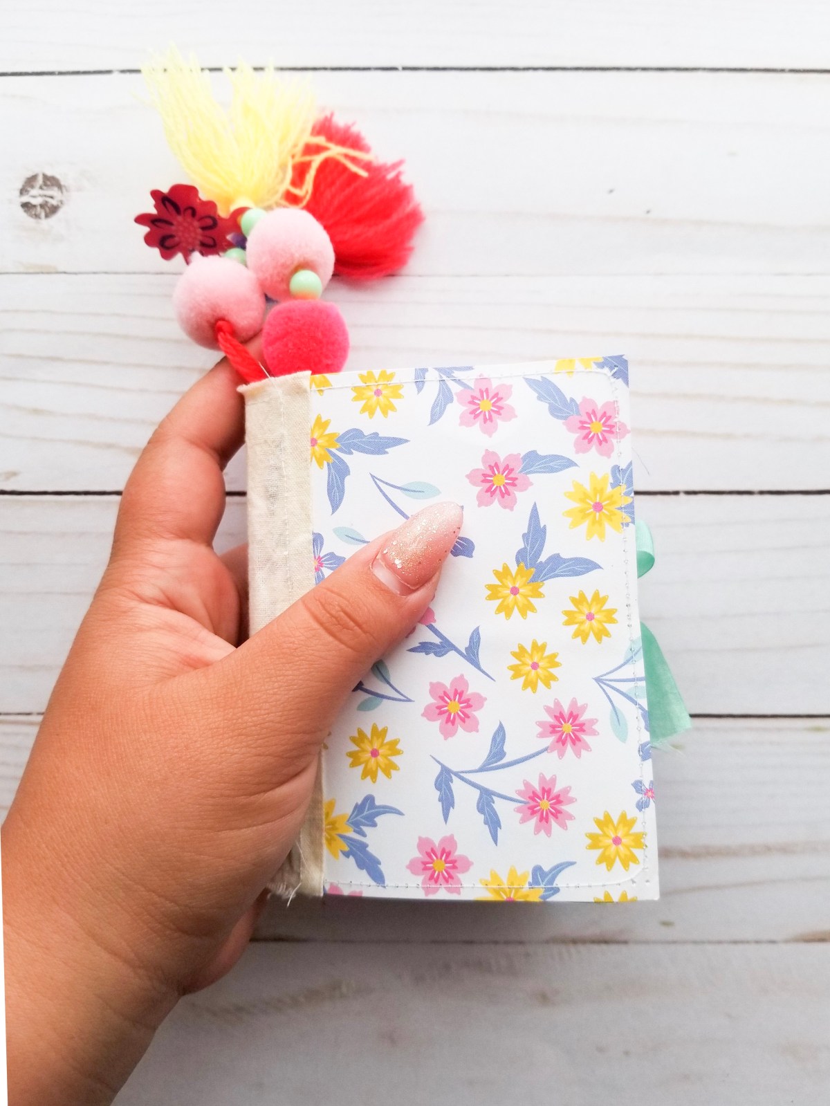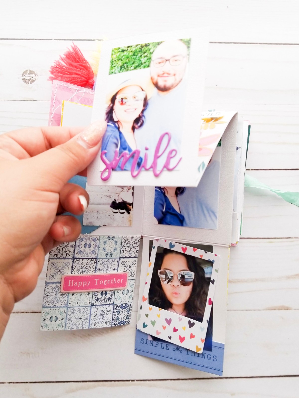 I then added some pretty patterned paper as my cover. The whole book was connected to the cover using some yarn string. Then I added two Amy Tangerine tassel and ribbon to finish it off.