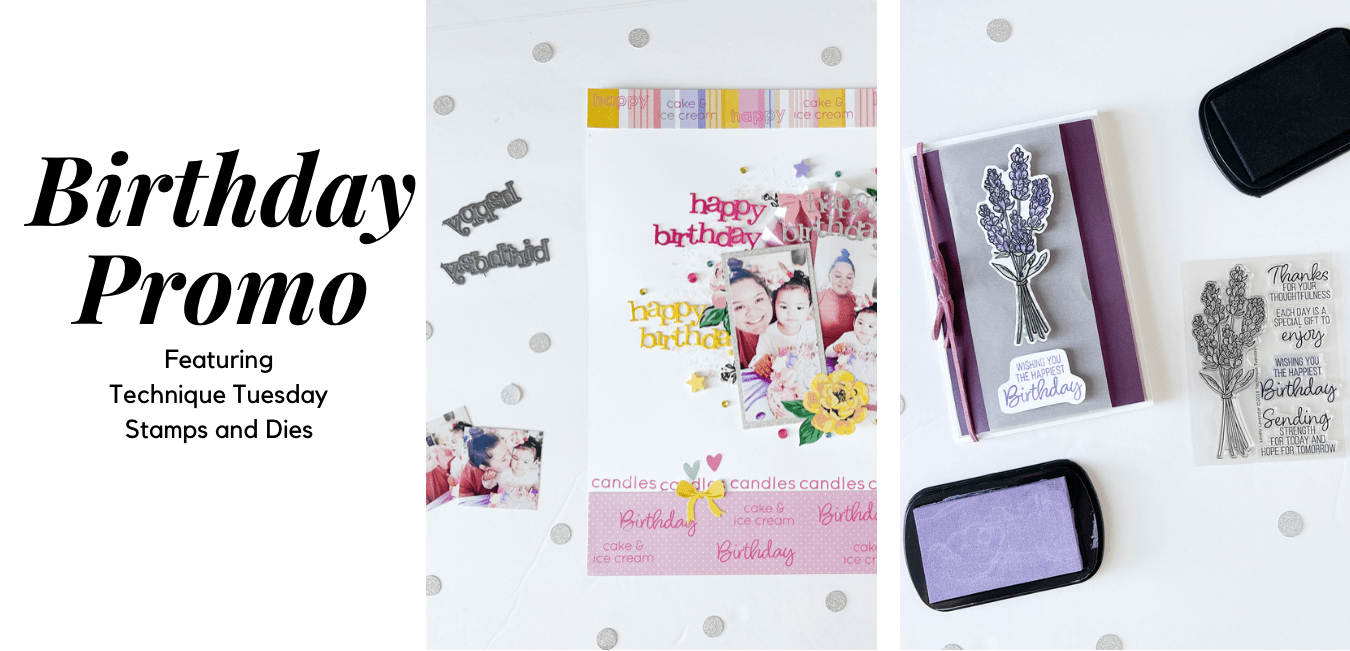 Today I’m sharing a card and layout featuring birthday themed stamps and dies from Technique Tuesday. Read on for all the details.